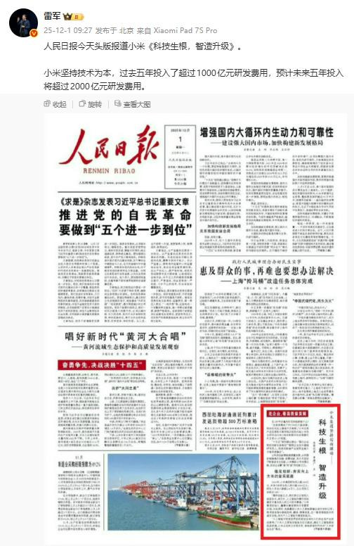 标题就叫《科技生根,智造升级》,专门讲小米造车的创新实践,还夸了它的超级电机、智能座舱这些核心技术,说它是“科技企业跨界造车的代表”。要知道官媒头版可不是随便上的,这相当于给小米的造车之路盖了个国家队认可的章。